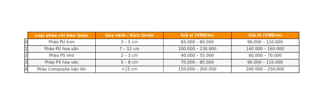 Không giống các loại phào nội địa, giá phào chỉ Hàn Quốc thường ổn định hơn nhưng vẫn chịu ảnh hưởng từ tỷ giá nhập khẩu và số lượng đặt hàng. Dưới đây là mức giá trung bình của thị trường: