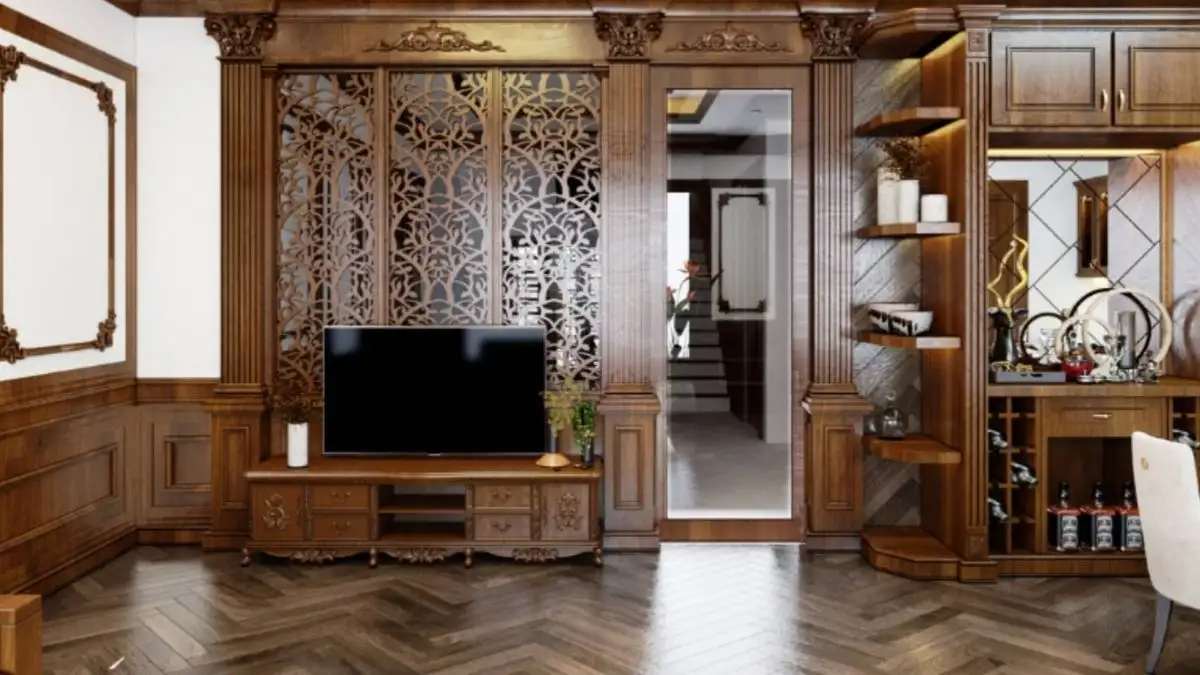 Tại phòng khách, phào gỗ đóng vai trò đồng bộ hóa toàn bộ hệ thống nội thất từ sofa, kệ tivi đến tủ trang trí. Nó giúp không gian tiếp khách có sự liên kết chặt chẽ và thể hiện rõ gu thẩm mỹ của gia chủ.