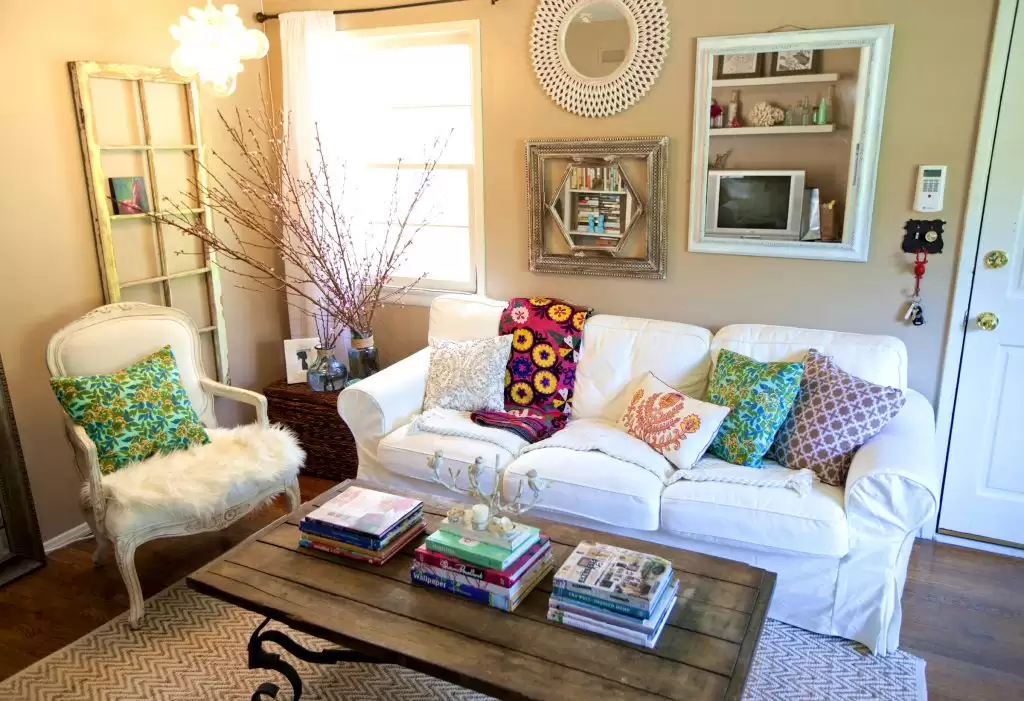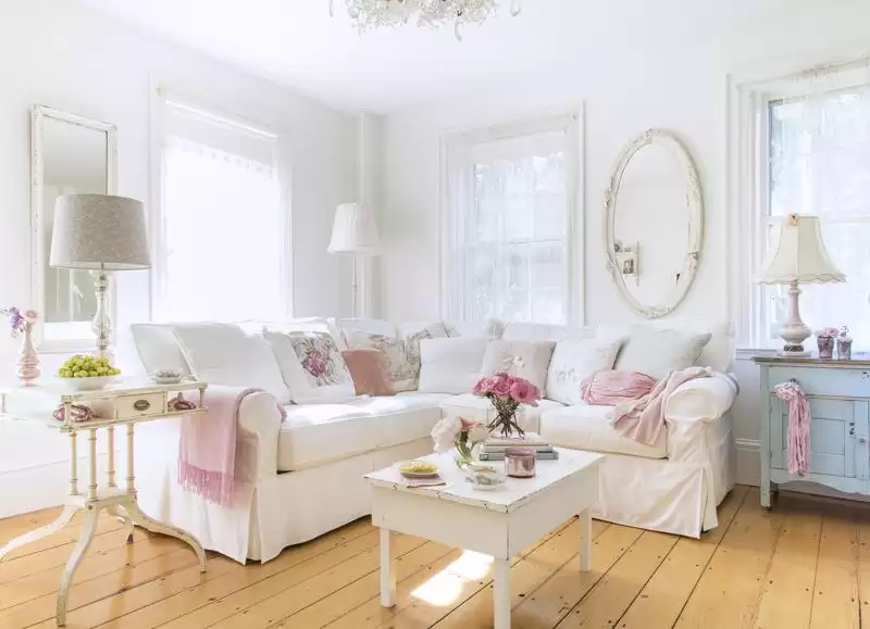 Ví dụ, phòng khách với sofa trắng, gối hồng pastel và bàn trà gỗ sơn loang là cách kết hợp vừa đơn giản vừa đúng tinh thần của phong cách thiết kế Shabby Chic.