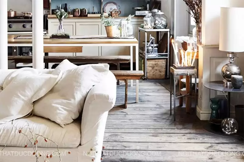Phong cách thiết kế Shabby Chic khai thác vẻ đẹp từ nội thất đã qua sử dụng. Ghế gỗ bong sơn, bàn trà sơn trắng loang lổ hay tủ kệ tái chế từ gỗ cũ là những chi tiết thường gặp. Sofa bọc vải cotton hoặc linen màu nhạt giúp không gian gần gũi và thoải mái. Điểm quan trọng là đồ cũ không bị coi là kém giá trị, mà được biến thành điểm nhấn, tạo dấu ấn cá nhân cho ngôi nhà.