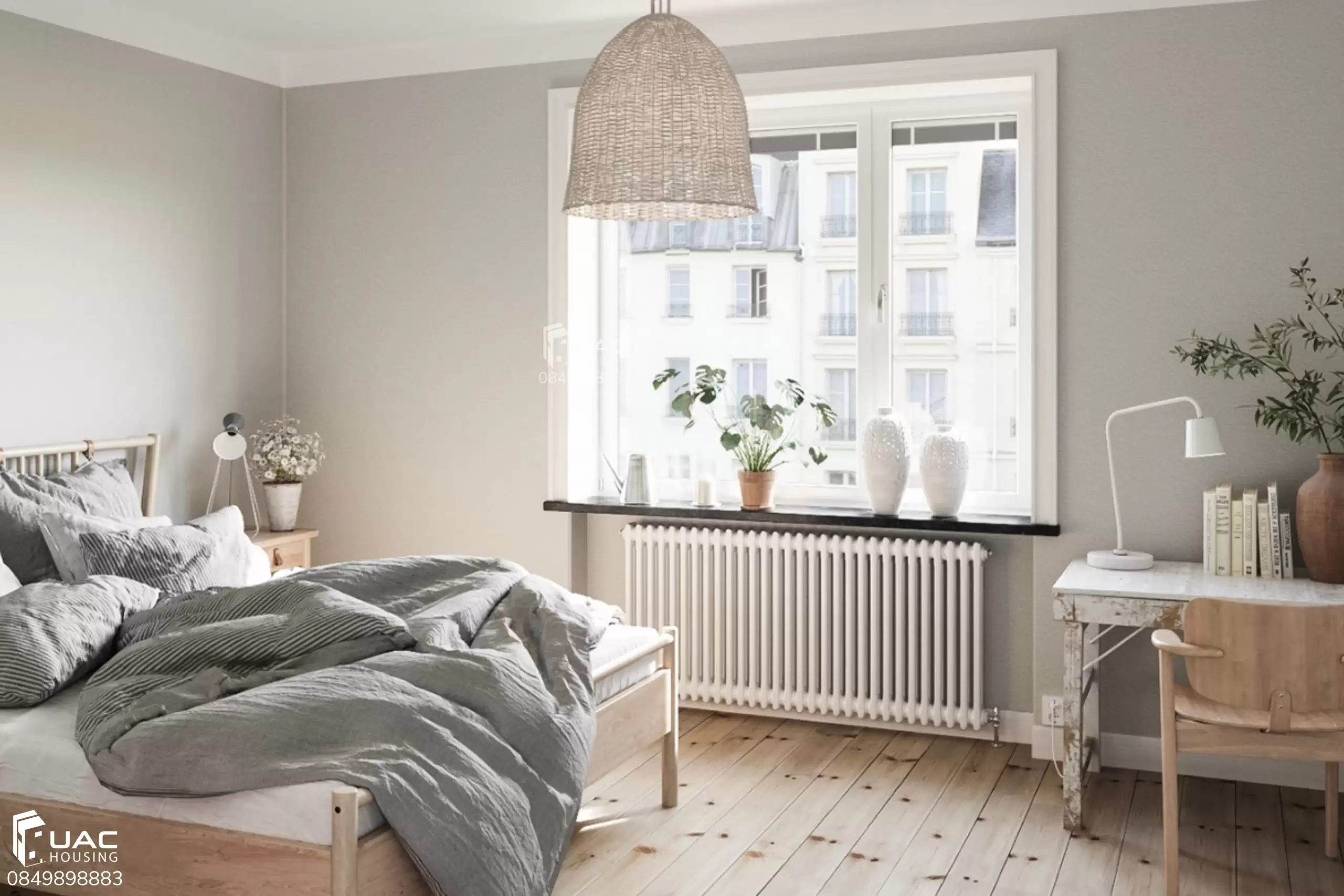 - Trang trí đơn giản: tranh canvas, gương tròn, cây xanh nhỏ.