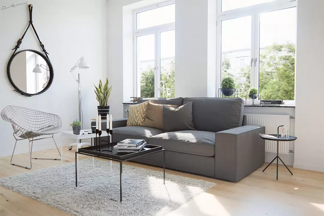 Ví dụ, một phòng khách Swedish tiêu chuẩn có thể gồm: sofa vải màu be, bàn gỗ tròn, thảm dệt tay, gương tròn lớn treo tường, cùng vài chậu cây nhỏ như monstera hoặc lưỡi hổ.