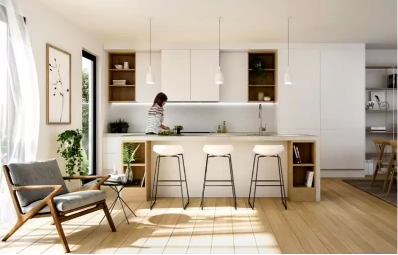 - Tủ bếp gỗ sáng màu, mặt đá trắng.