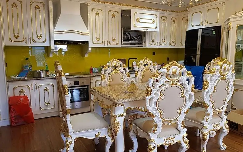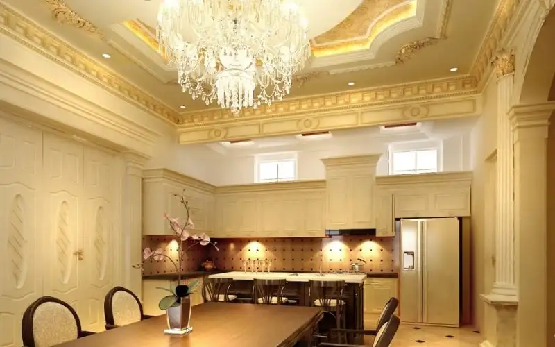 - Hoa văn tinh xảo, thể hiện sự sang trọng của trần nhà bếp.