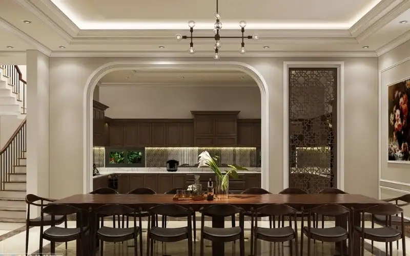 Phào chỉ giúp hoàn thiện viền trần và tường, tạo cảm giác sang trọng và đồng bộ với tổng thể nội thất. Khi kết hợp với tủ bếp gỗ, đèn trần hoặc trần giật cấp, phào chỉ đóng vai trò như một chi tiết “chốt lại thiết kế”, mang lại cảm giác chuyên nghiệp và tinh tế cho căn bếp.