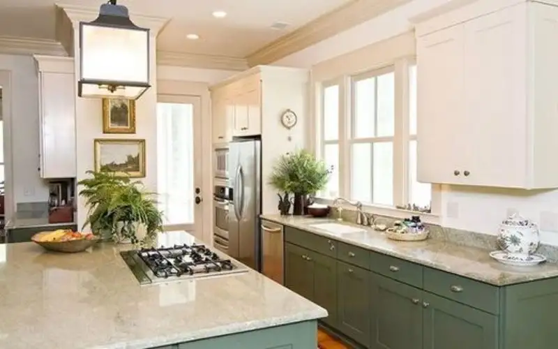 - Các màu trắng, kem, xám nhạt giúp bếp trông sạch và thoáng.