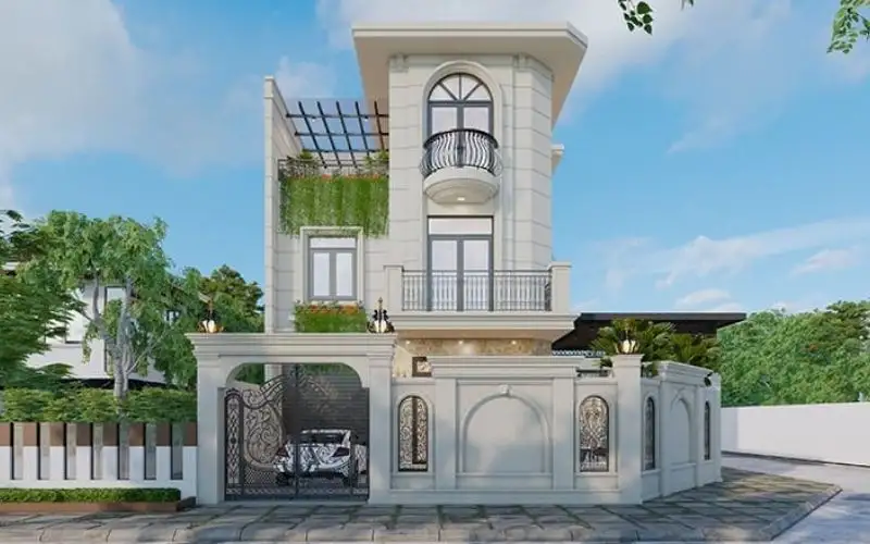 Hoa văn mềm, tỷ lệ vừa phải, thường sơn màu trắng hoặc kem để tăng cảm giác sang trọng cho mặt tiền.