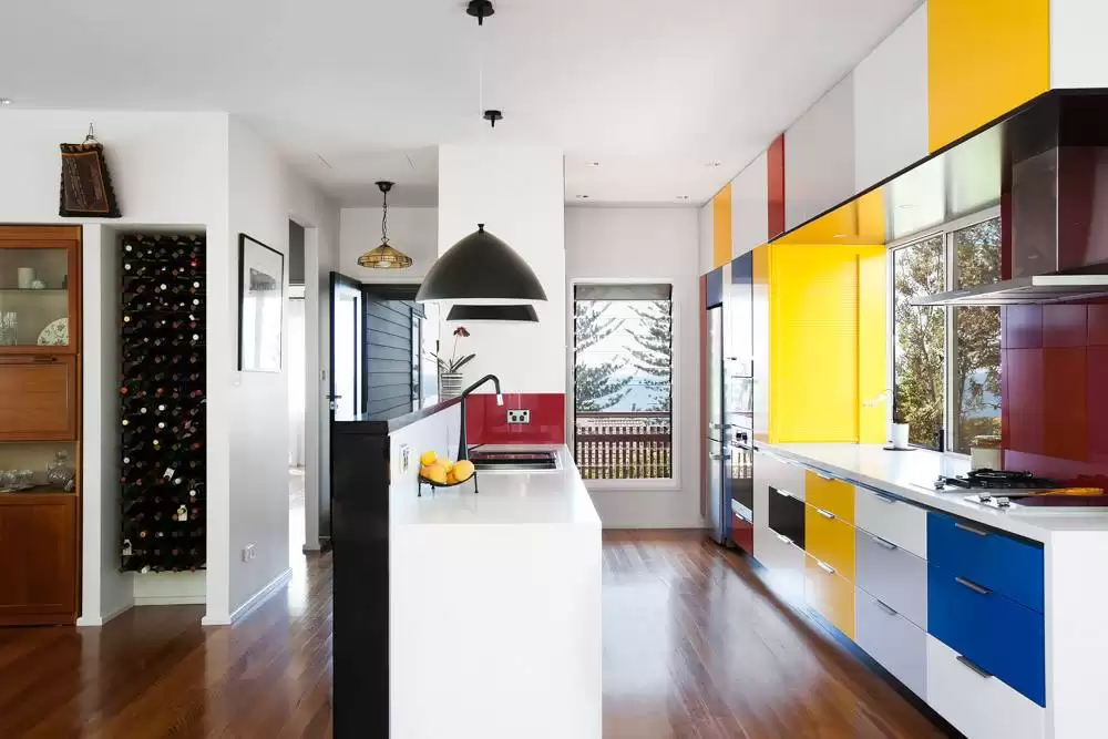 Khu bếp và phòng ăn trong phong cách nội thất De Stijl thường được thiết kế phẳng, hạn chế chi tiết. Tủ bếp phân mảng màu cơ bản như trắng, đen, đỏ hoặc xanh, tạo sự cân bằng. Bàn ăn hình vuông hoặc chữ nhật, ghế gỗ phối màu đặc trưng De Stijl để đồng bộ thẩm mỹ. Cách bố trí này giúp khu bếp gọn gàng, dễ vệ sinh và duy trì lâu dài.