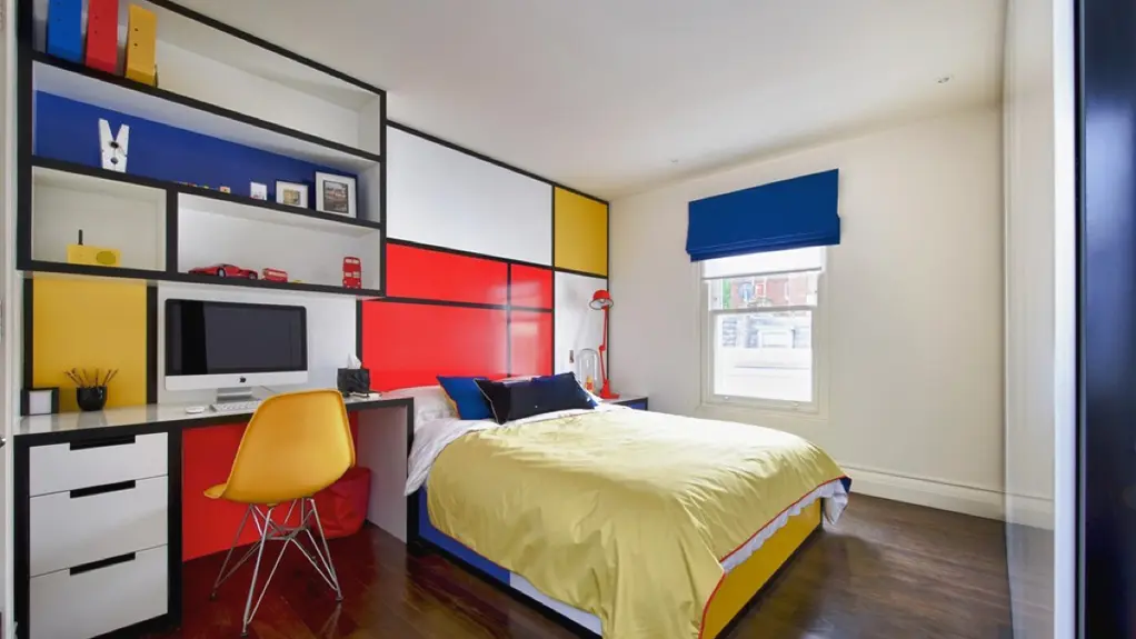 Phòng ngủ De Stijl giữ đúng tinh thần tối giản nhưng vẫn nổi bật nhờ gam màu nguyên bản. Giường gỗ có thiết kế đơn giản, kết hợp bộ chăn ga màu đỏ, xanh, vàng. Đèn ngủ đặt trên tủ đầu giường hình khối cơ bản để đồng bộ với tổng thể. Không gian trở nên trẻ trung, sáng rõ mà vẫn dễ ứng dụng trong thực tế.